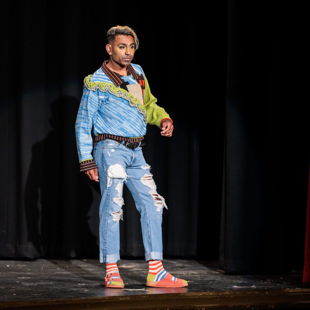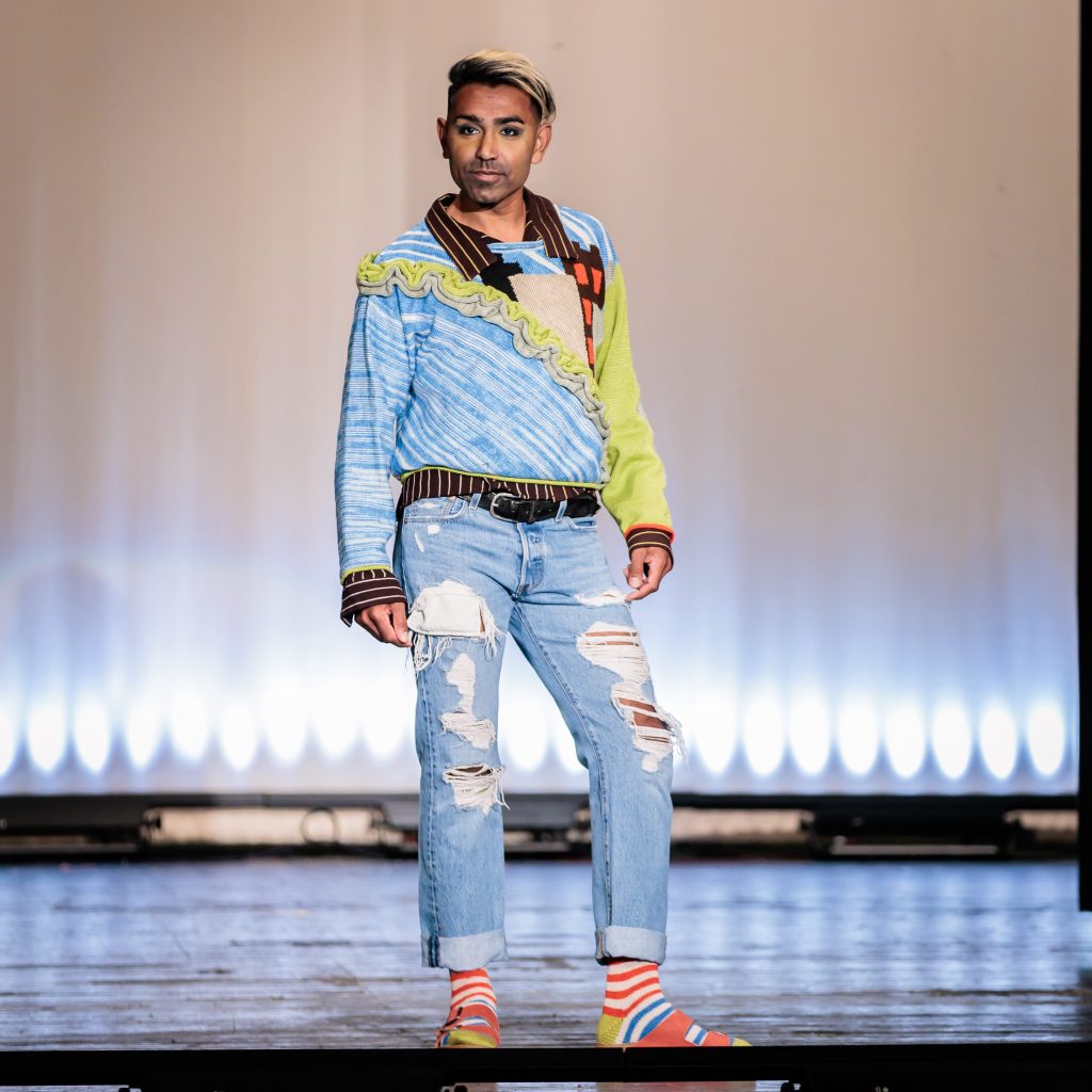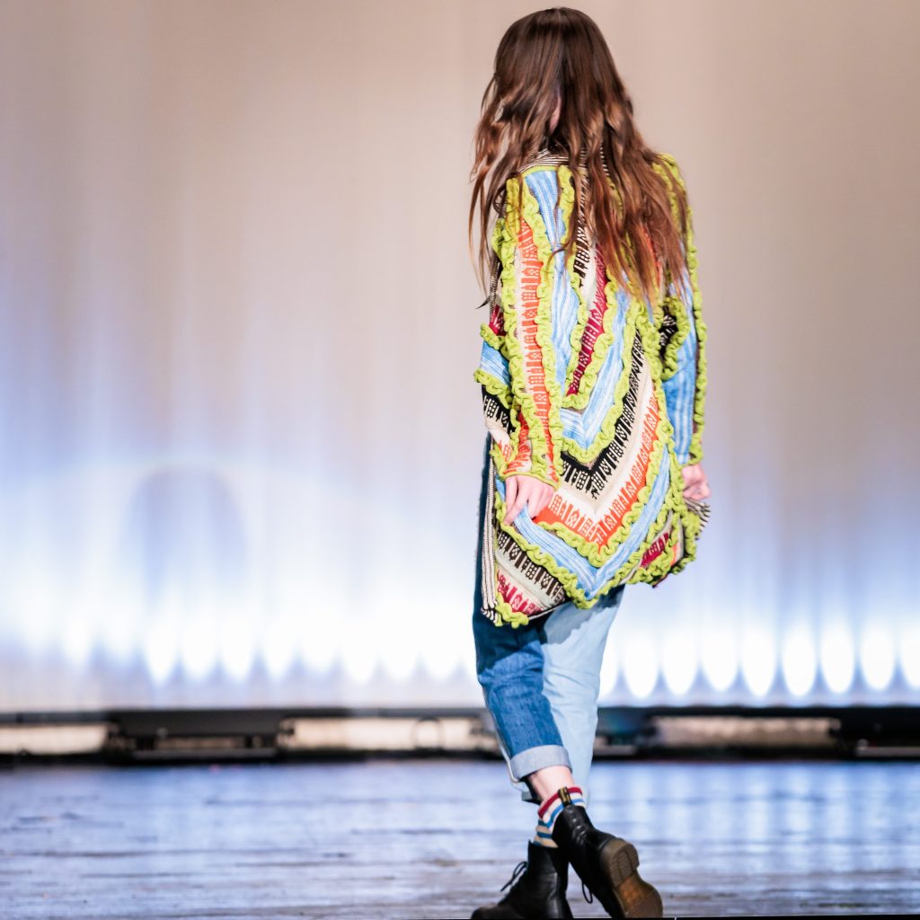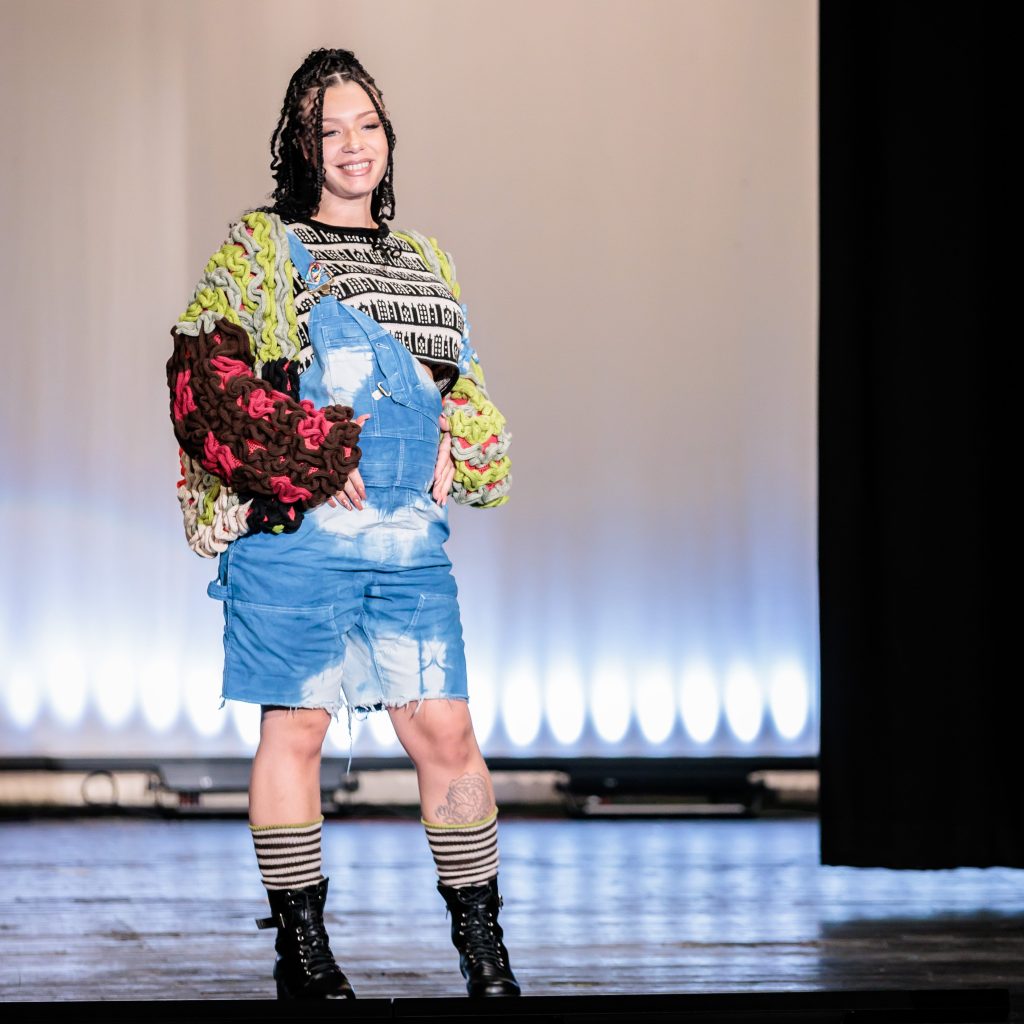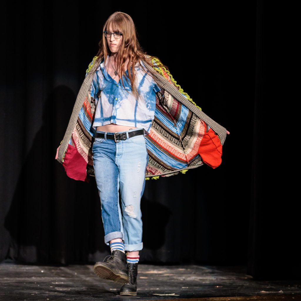 This micro-collection was created for Shepherd Wellness Community Red Ribbon Benefit Fashion Experience in October of 2024. I was inspired by the few sunny days we get here in Pittsburgh. The sun sparking off the river, the little houses littered over the tree-covered hillsides. The knitted pieces were made from pearl cotton and cotton mesh on a Brother KH-890. The jeans are thrifted.